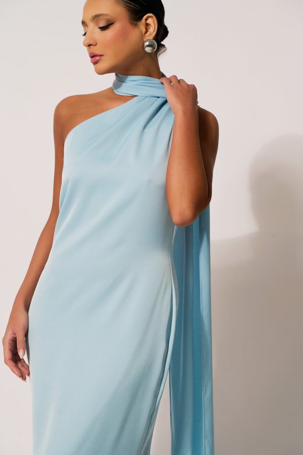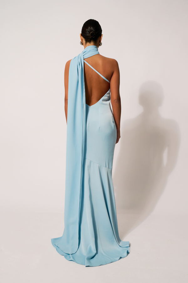 Το Camelia Dress είναι η απόλυτη επιλογή για ξεχωριστές περιστάσεις, συνδυάζοντας πολυτέλεια και κομψότητα. Φτιαγμένο από κρεπ σατέν ύφασμα σε baby blue απόχρωση, προσφέρει μια κομψή και σικ σιλουέτα που αγκαλιάζει διακριτικά το σώμα. Η εντυπωσιακά ανοιχτή πλάτη χαρίζει θηλυκότητα και χαρακτήρα, ενώ το φουλάρι που περνάει απαλά γύρω από το λαιμό προσθέτει μια μοναδική, ρομαντική νότα στο σύνολο.
