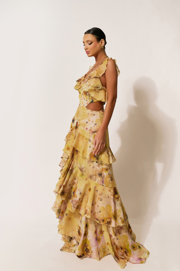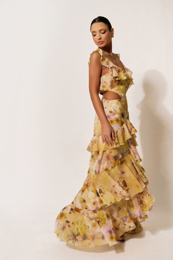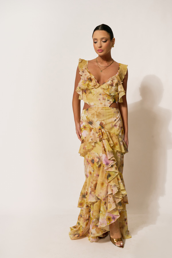 Αναδείξτε την πιο λαμπερή και θηλυκή πλευρά σας με το Soleia Maxi Ruffle Dress, από την Premium συλλογή μας. Η φούστα με τα αμέτρητα βολάν χαρίζει μοναδική κίνηση, ενώ η διακριτική λάμψη από lurex στην ύφανση δίνει μια ιδιαίτερη πινελιά. Τα κοψίματα στο πλάι τονίζουν τη σιλουέτα με διακριτικό αλλά εντυπωσιακό τρόπο, καθιστώντας το ιδανικό για τις πιο λαμπερές εκδηλώσεις.