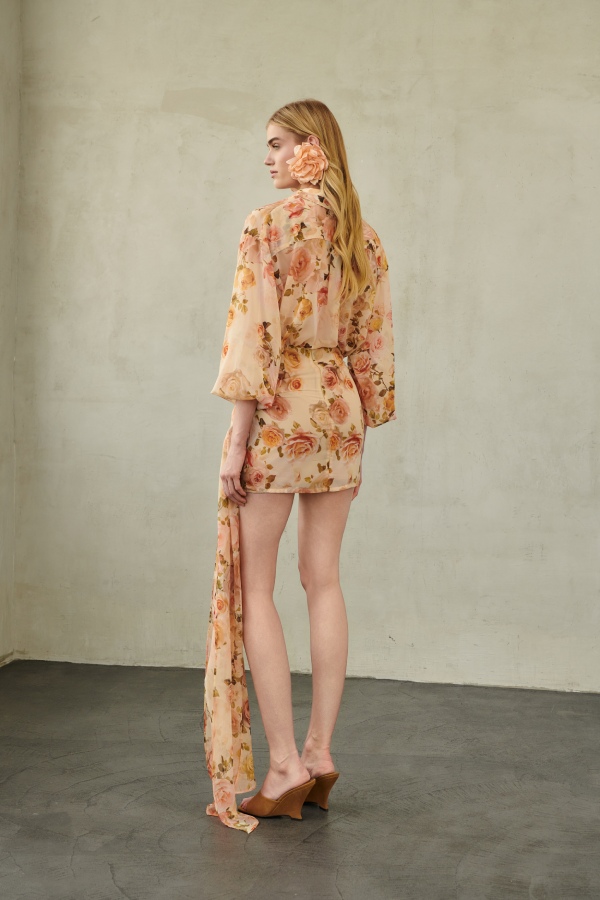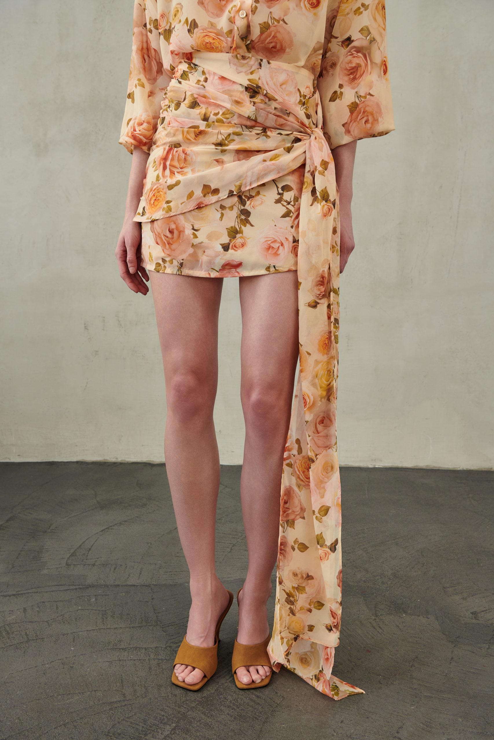 Sorelle Mini φούστα σε peach απόχρωση με floral print και μακρύ μαντήλι που κρέμεται, προσθέτοντας κίνηση και φρεσκάδα στο look. Άνετη και ευκολοφόρετη, ιδανική για casual ή πιο προσεγμένα σύνολα.