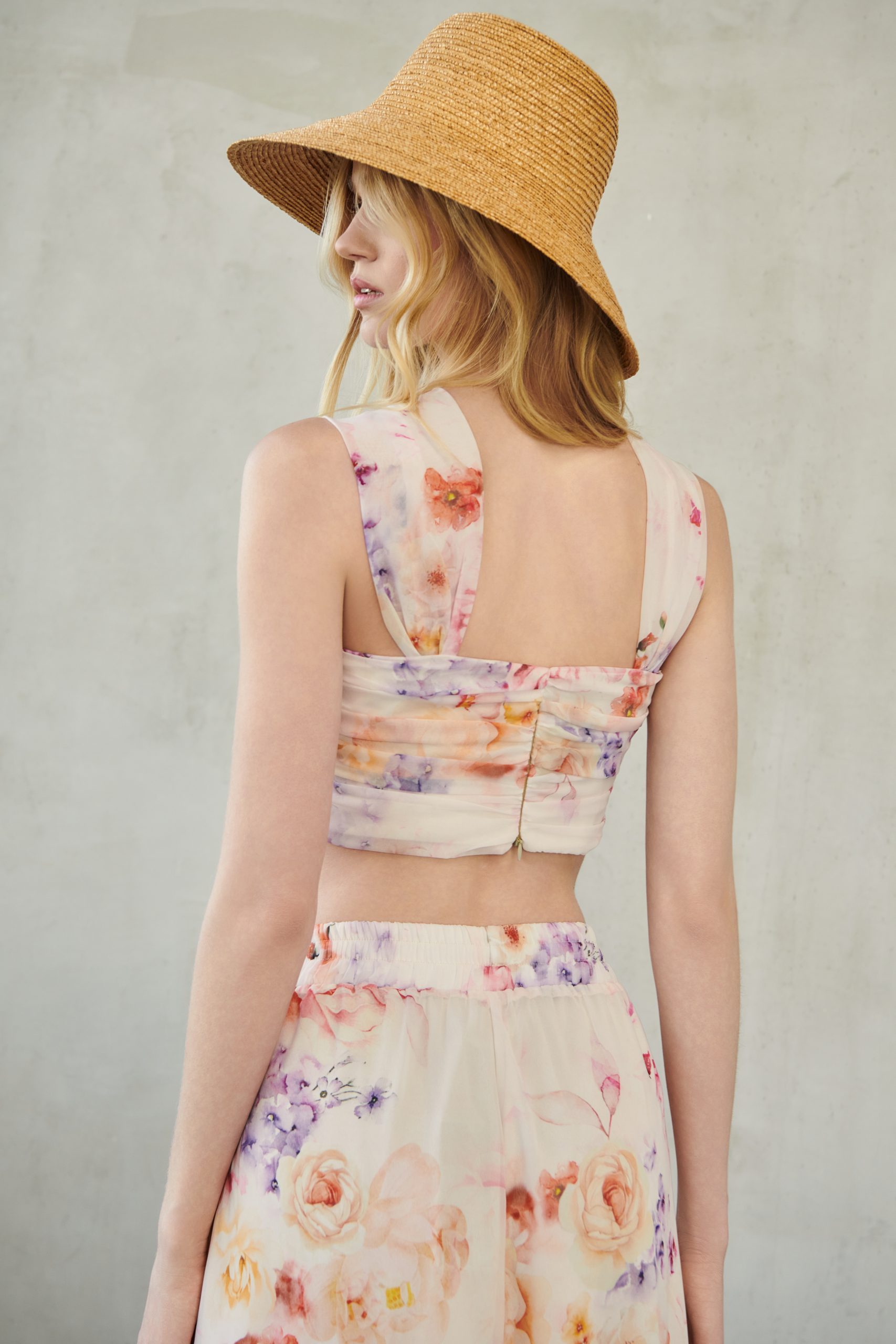 Τοπ σε λευκή βάση με διακριτικό floral print και λεπτομέρειες με άνοιγμα και κομψούς κόμπους μπροστά. Ιδανικό για καλοκαιρινές εμφανίσεις, μπορεί να φορεθεί τόσο με παντελόνια, όπως το Villy Pants, όσο και με φούστες για effortless στυλ όλη μέρα.