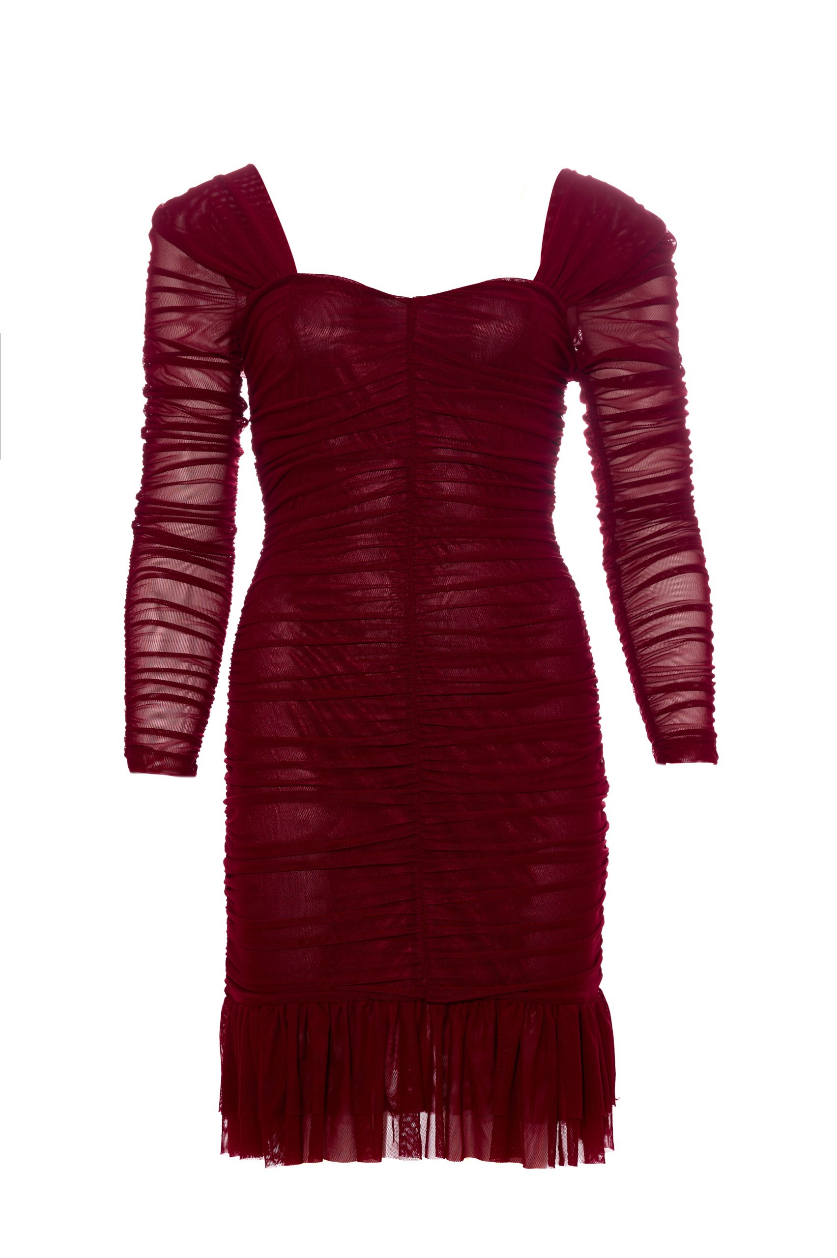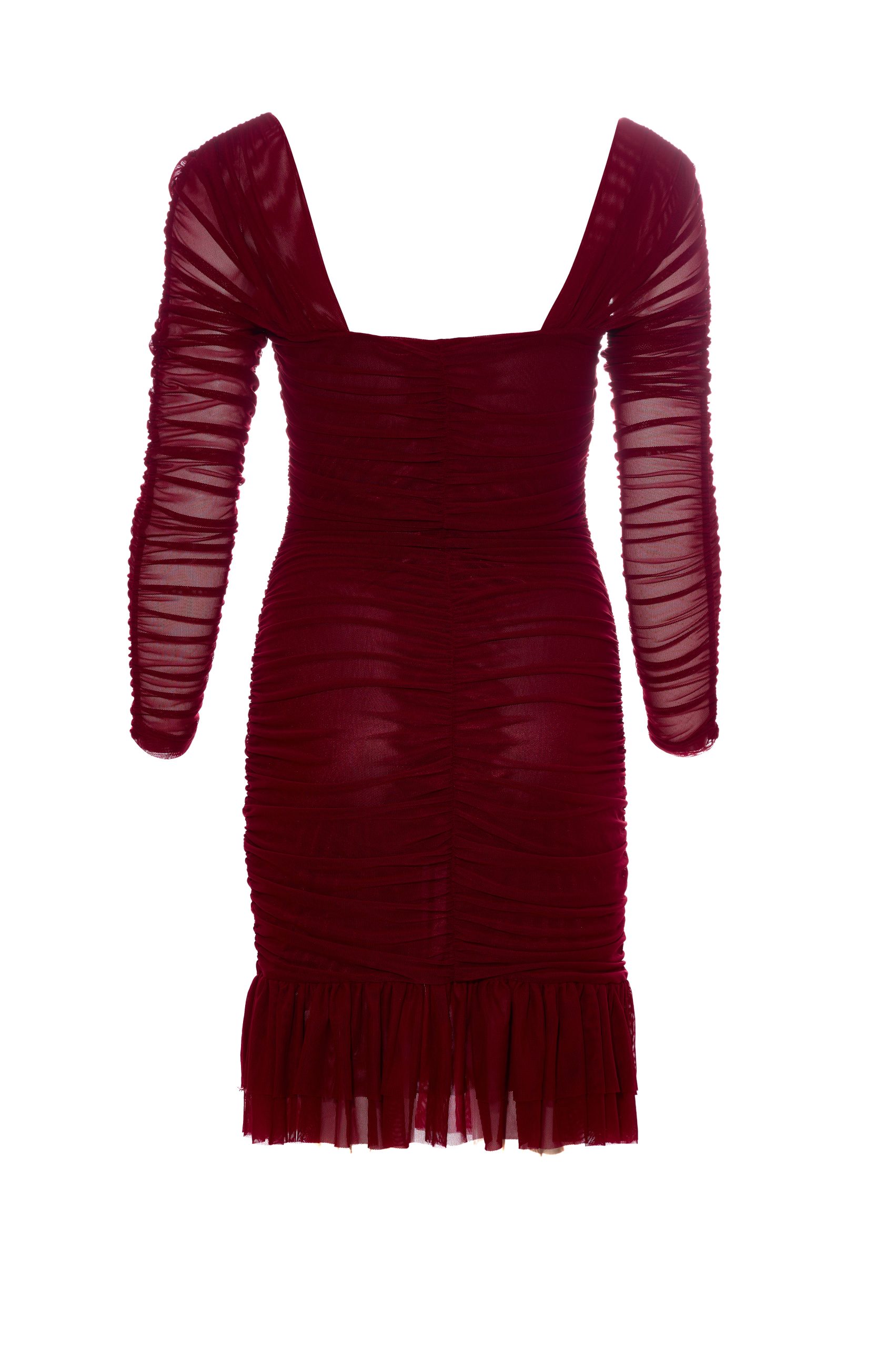 Το Wine Mini Mesh Dress είναι ένα εφαρμοστό γυναικείο μίνι φόρεμα από ελαστικό τούλι σε υπέροχη μπορντώ απόχρωση. Το βολάν στο τελείωμα προσθέτει κίνηση, ενώ οι σούρες αναδικνύουν την σιλουέτα.